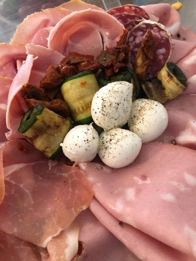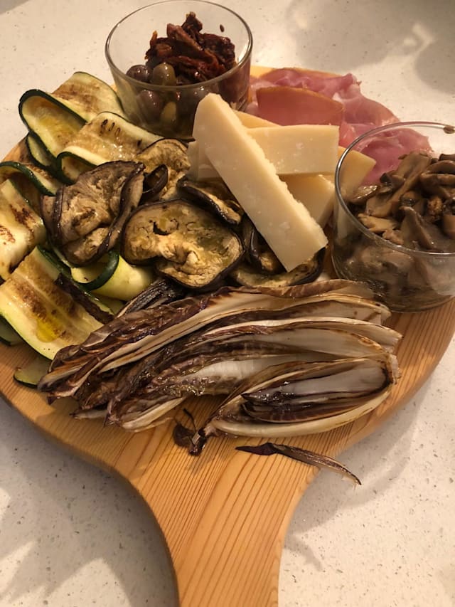 - (Melanzane, zucchine e radicchio grigliati, olive miste, pomodori secchi, parmigiano reggiano 30 mesi e gran cru di pecora)