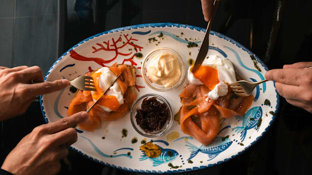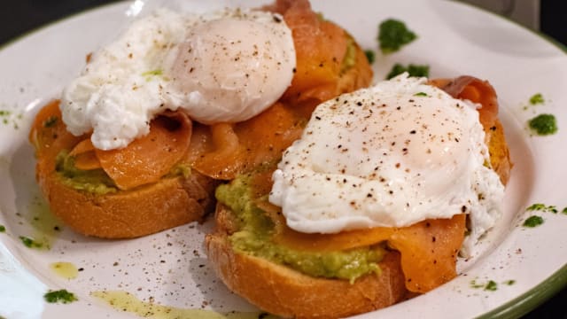 Pane tostato con crema di avocado; salmone affumicato e uovo in camicia