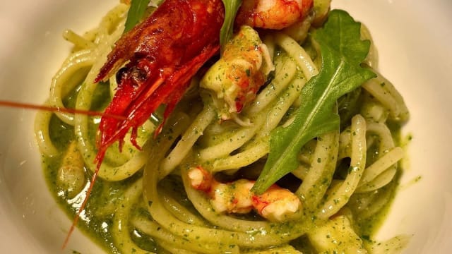 Crema di pistacchio, bufala campana dop, mortadella, crocché, stracciatella, olio evo e basilico