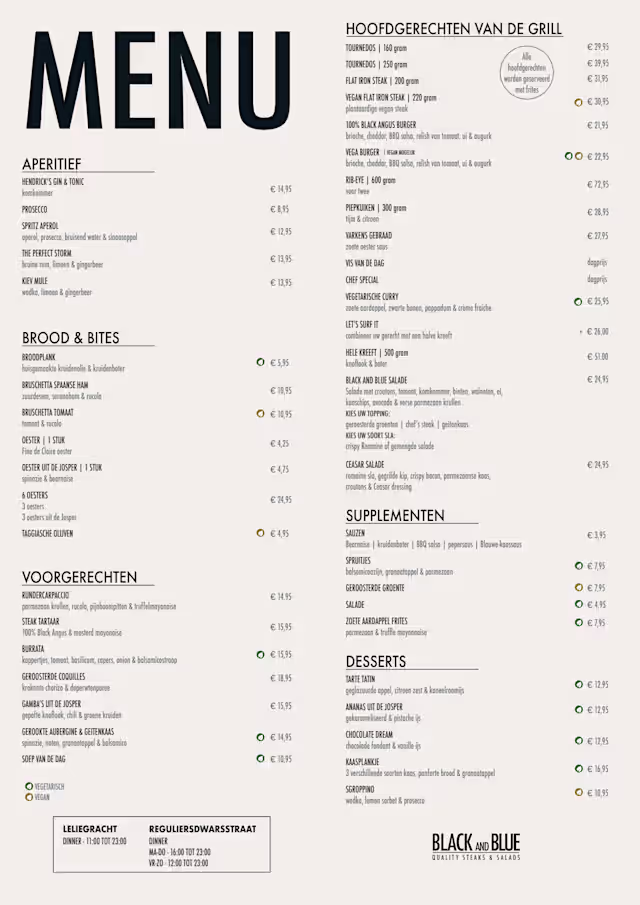 10/10On our last night visiting Amsterdam we wanted a nice steak dinner and Black and Blu delivered in a big way! The drinks were great, the bread was warm and delicious. The steaks were cooked to perfection!