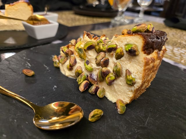 Cheesecake casero con sirope a elegir: de dulce de leche, chocolate o frutos rojos.