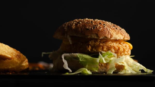 Con carne 100% angus, queso cheddar, cebolla caramelizada, ali-oli y brotes tiernos, acompañado por patatas fritas.