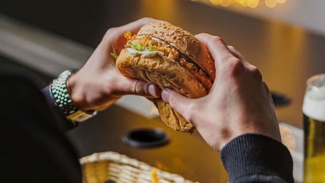 Cotoletta di ceci (fake chicken) insalata, pomodoro, maionese, patatine fritte, spina 0.20 o bevanda a scelta