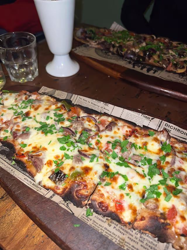 - Fromage fondant, émincé d'agneau mariné, pastırma, tomates, poivrons rouges et verts, champignons, oignons.
