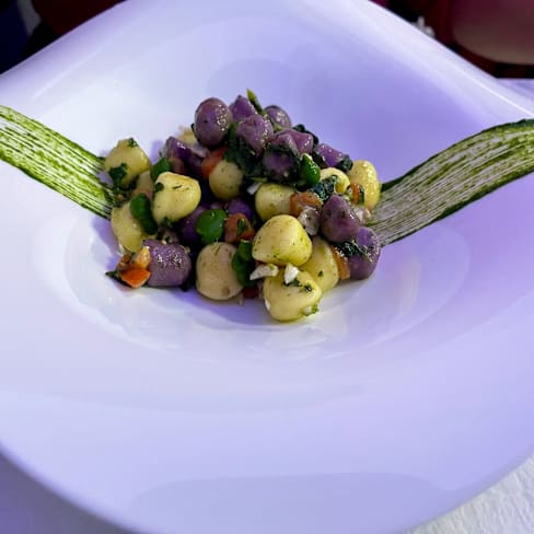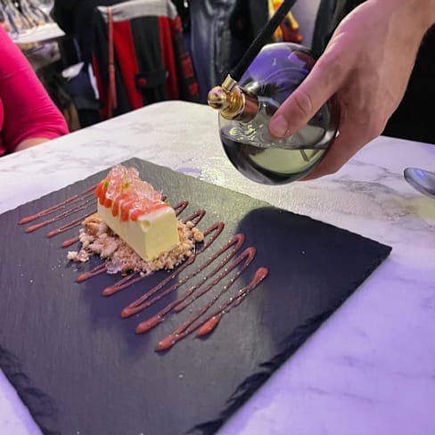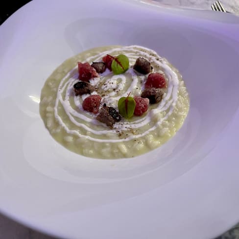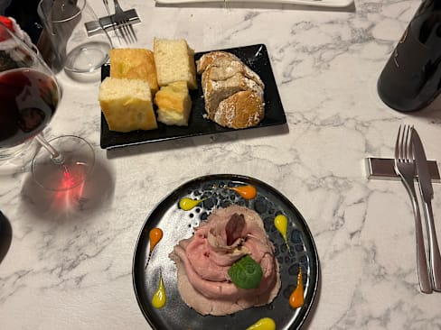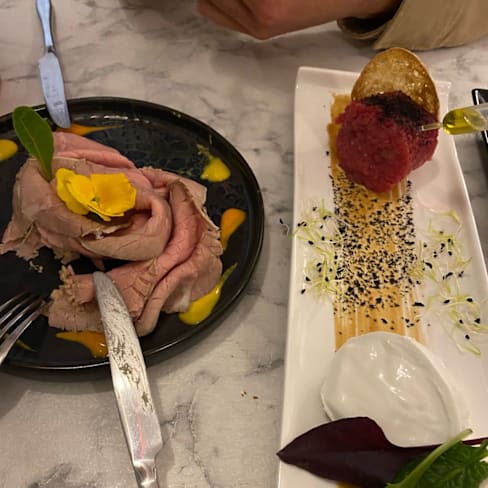 9.5/10The menu offers some excellent dishes, with some interesting ingredients or combinations that make it stand out from “standard” restaurant dining. We started with their really excellent (and beautifully presented) antipasto assortment featuring five superb tastes. It features an Insalata Russa that has so much less mayonnaise than the typical stuff you get that it lets you really taste the flavors; a battuta of raw meat that is perfectly salted; a salsiccia di Bra coated with a very finely chopped hazlenut to add the taste without making the dish too crunchy; a Vitello Tonnato made with the traditional ingredients which tasted great; and some delicious filled peppers. Small servings of each but they combine for a great opener. My “Acquarello” risotto featured a cream of friggitielli (a pepper used in southern Italian cooking) plus a swirl of Burrata and then topped with both raw and grilled pieces of salsiccia di Bra had the perfect consistency of creamy texture and rich tastes. It had been finished with a sprinkle of pepper adding just the right bite. My wife’s Gnocchi had both Violet-colored gnocchi as well as traditionally colored ones, along with some branzino fish and cima di rapa (turnip top) for a bit of bitterness. She enjoyed it, and said it was very mild tasting. For our dessert we had their Gin & Tonic, a beautifully crafted semifreddo that is drizzled with some strawberry sauce and then topped with pieces of clear gelatin made with tonic water that give it an intriguing bitter contrast and then the waiter sprays it with gin from a misting sprayer. Great taste and what a presentation. The presentations are elegant, from the plates themselves and the cutlery rests for fork and knife. Service is excellent and so attentive. The server makes sure to describe each dish as it’s served which refreshes your mind on what to expect as you start tasting what you ordered — this is a very nice touch. Unfortunately on the night we came, the head bartender was not here so their signature cocktails (with some unusual combinations and offerings) weren’t available. We asked about them and they said those are the bartender’s own creations and not something another bartender can go ahead and mix. But they do make cocktails to order and I had a Bloody Mary and my wife had a Negroni mixed with Mezcal. On my first sip my drink missed some of the spiciness I hoped for, so I asked for it to be added and the server had it done and back to me in a flash (and asked me soon after if it was now spicy enough). My wife’s Negroni was excellent though it could have been served with less ice and more drink (Negronis are often served with no ice, having been chilled during the making). It was a bit of a surprise that the drinks cost more than the signature cocktails listed on the menu, since our drinks were made since those weren’t available. (Not a ton more money, just a couple of euros more apiece.) The place looks sleek and modern, but the sound level creates a bit of a problem. The walls reflect sound very much and the alcove in which we were dining had three tables so at times conversations and noises got amplified. The music also plays a little loud for our tastes and the sound of a young baby crying in the main room also gets amplified. Maybe some sound-absorbing wall treatments could mitigate the noise levels a bit and make it a bit more comfortable. But overall a very enjoyable meal and experience. The head bartender is apparently off on Mondays and Tuesdays so when we come back to try those special drinks we will plan for a different night.