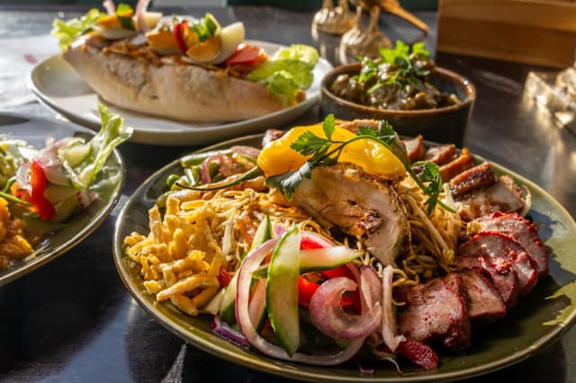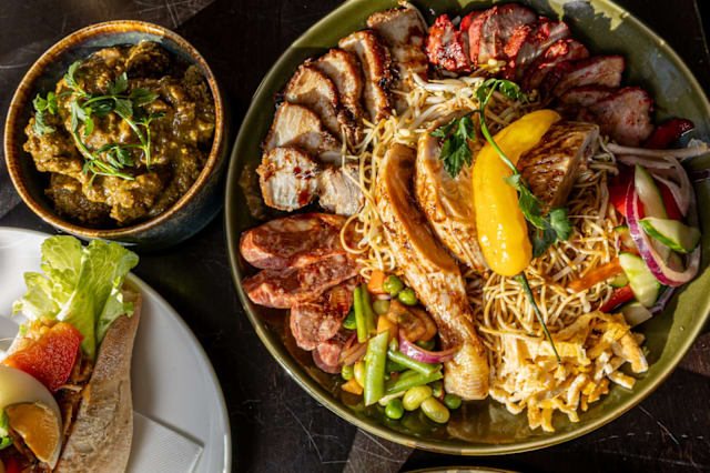 Cha sui van geroosterd speenvarken met fa chong (chinese worst), gegrilde buikspek en geroosterde kip, met verse groenten, omeletreepjes, zoetzure komkommer en gebakken banaan