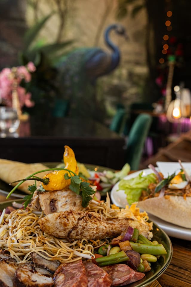 Geroosterde kip, hete kip en kipsaté met verse groenten, omeletreepjes, zoetzure komkommer en gebakken banaan