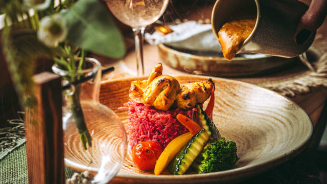 Grilled salmon fillet served with beetroot rice, grilled vegetables & coconut sauce