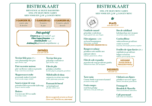 Bij Bleue Bar Bistro serveren we de moderne, Franse keuken.