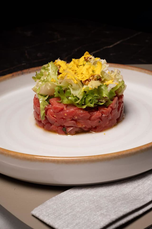 Tartare di fassona piemontese con insalatina di scarola al gin, senape dijon e tuorlo d’uovo