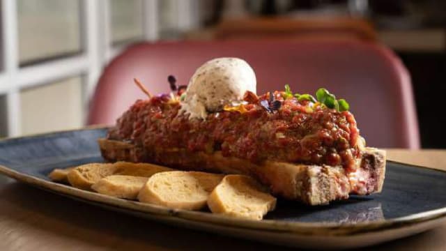 Steak tartar sobre tuétano braseado y heladode mostaza a la antigua