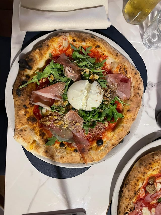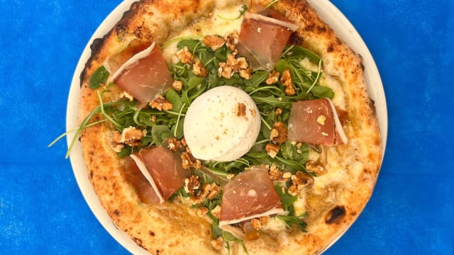 Prosciutto crudo di parma, rucola, bocconcini di mozzarella di bufala, pomodorini datterini, scaglie di parmigiano, fiordilatte campano, olio evo, basilico