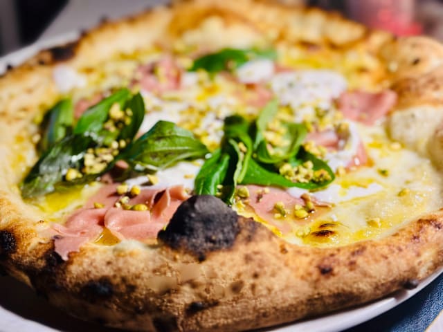 Mortadella, fiordilatte campano, stracciatella fresca di bufala, granella di pistacchio, olio evo, basilico