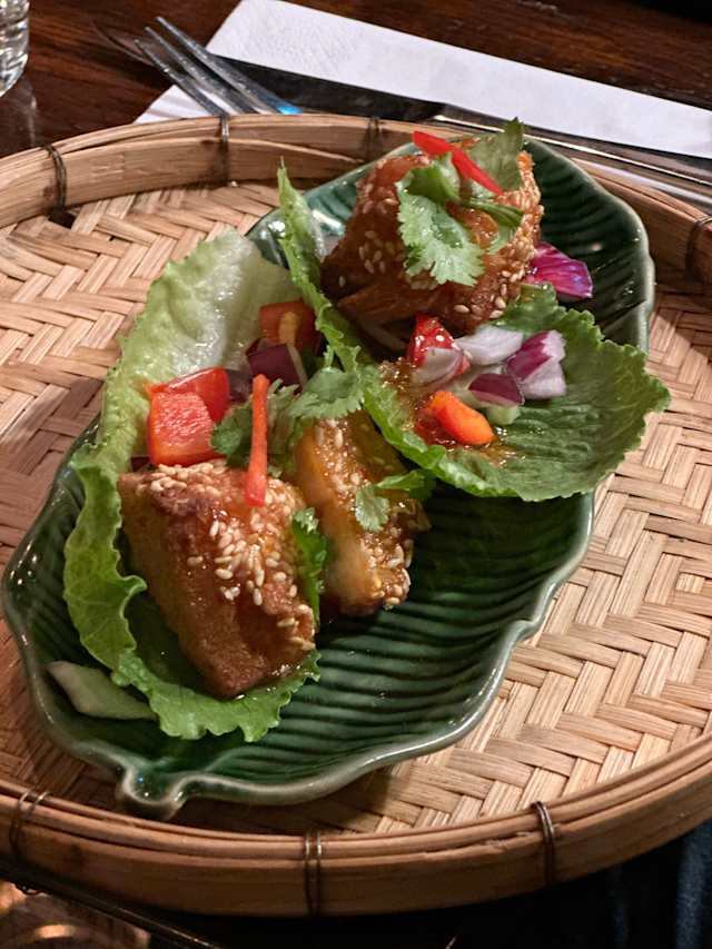 - Välsmakande kyckling- eller biffsallad med limejuice, myntablad och rostad chili, serveras på färska salladsblad (179kr som huvudrätt)