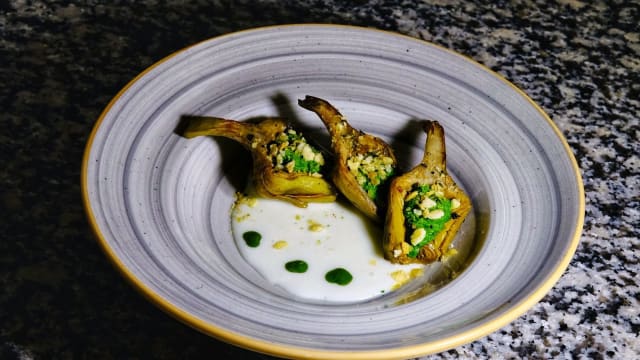 Carciofi ripieni alla ligure, estratto di prezzemolo e il suo fondo