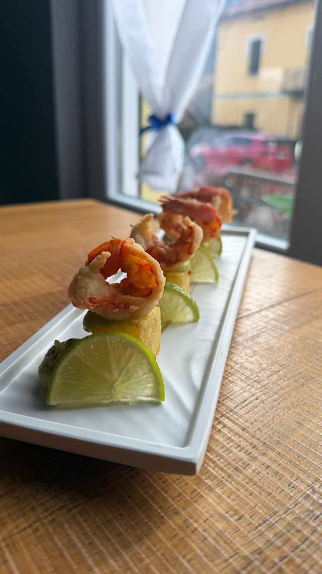 - Gamberoni del sud America fritti con crema di avocado e patate