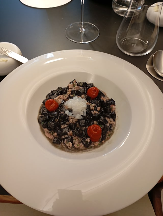 GNOCCHETTI AL NERO DI SEPPIA, RAGÙ DI CALAMARI, DATTERINO ALLA BRACEI