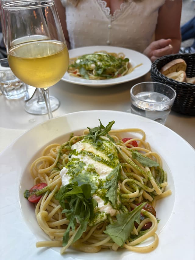 6/10Bit disappointing, arrived at about 8:20 for 8:30 reservations. Only 1 woman at table inside, outside several tables occupied with what looked like HH folks winding up. Only 1 woman behind bar at time in terms of servers, after a few minutes greeted me and I said had reservation, she checked and asked where I wanted to to sit, decided on table outside closer to inside. Since no one else outside eating decided on just Vitelli tomato and glass of wine. Saw another woman server join original. It was okay but not what expected.