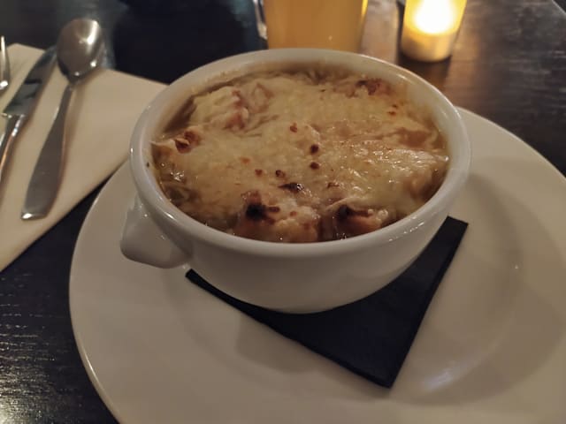 4.5/10Food is average at best. Onion soup quite bland. Too expensive for the quality. Loud music playing in an empty restaurant