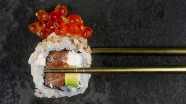 - All’interno: alghe, riso, gambero in tempura e cetriolo; all’esterno: avocado, maionese giapponese e salsa teriyaki