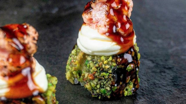 - 8 pz (Hosomaki in crosta di pistacchio con salmone e philadelphia all’interno; all’esterno: tartare di salmone scottato, salsa teriyaki)