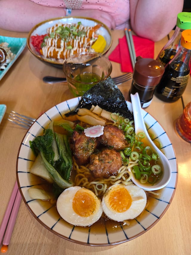 Soupe ramen végé, avec légumes et tofu. Servis avec légumes, algues, bambou, ciboulette, et un oeuf ajitama (sauf wonton et unagi).