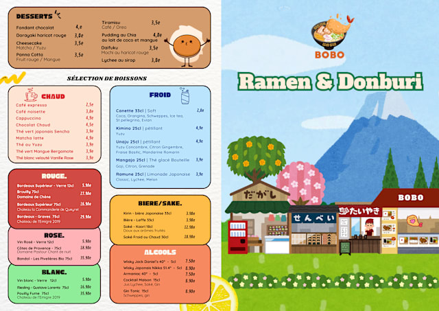 Servi avec morceaux de poulet pochés et petits légumes. Servis avec légumes, algues, bambou, ciboulette, et un oeuf ajitama (sauf wonton et unagi).