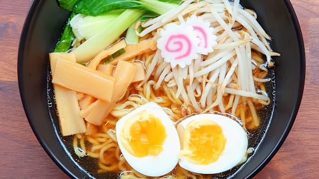 Soupe ramen végé, avec légumes et tofu. Servis avec légumes, algues, bambou, ciboulette, et un oeuf ajitama (sauf wonton et unagi).