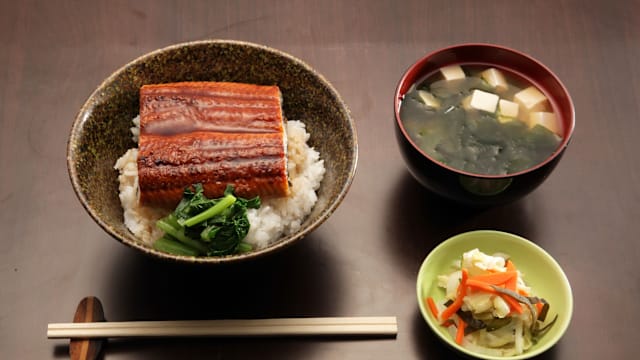 Bol de riz à l'anguille grillée avec légumes assortis et une sauce spéciale unagi. Servie avec du riz ,accompagnéau choix de viandes, poisson, légumes etc.
