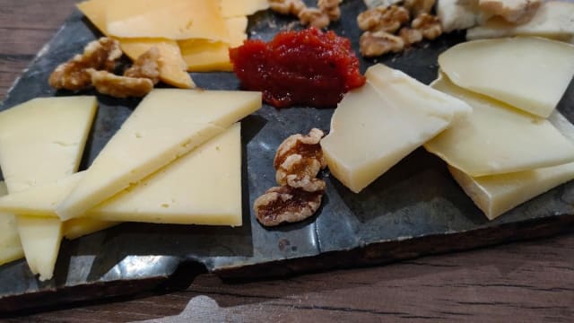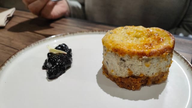 - 30 Días de maduración, salsa mostaza, queso brie fundido, cebolla caramelizada, galleta maria y bacon ahumado