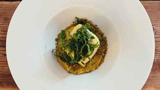 - purea e croccante di finocchio, salsa all'arancia (GF)