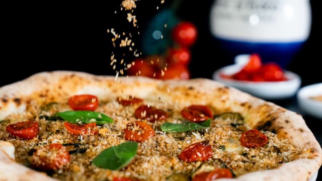 Oro rosso san marzano, nuvole di fiordilatte campano, olio extravergine d’oliva estratto a freddo, foglie di basilico fresco. A farcitura del cornicione: ricotta fresca e pepe nero