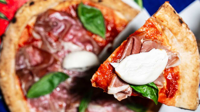 Oro rosso san marzano, cuore di bufala campana D.O.P.; fuori forno: crudo dolce di parma, blu di bufala, scaglie di parmigiano reggiano, foglie di basilico fresco