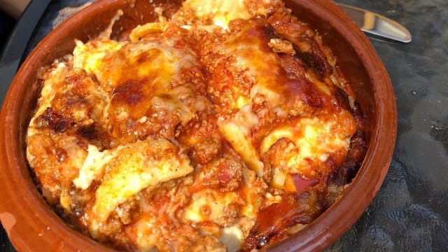 Onze huisgemaakte tomatensaus, plakjes aubergine en overheerlijke kaas
