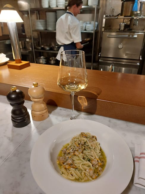 10/10I had a delicious lunch. The clam pasta was very creamy and tasty! Carmela and Eleanora were very attentive and recomended me an exquisite wine. I sat at the bar and could see the kitchen, how they were preparing the dishes and speak with the chefs. It was a joyful lunch!