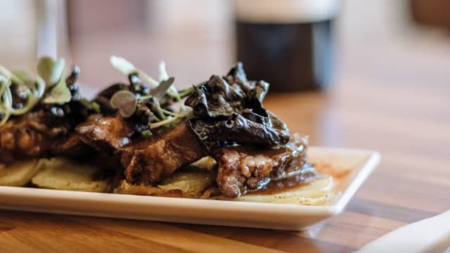 Costelles de porc lacades i dessosades amb salsa hoisin sobre parmentier.