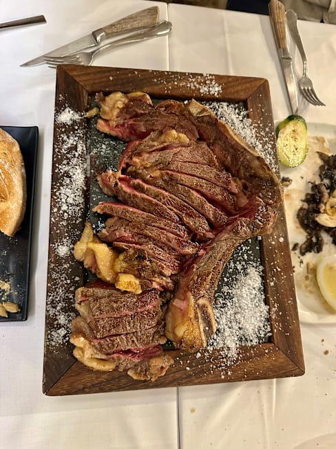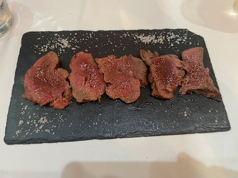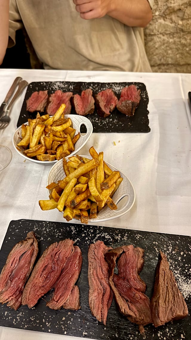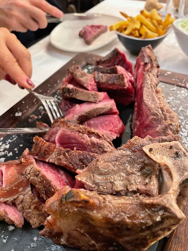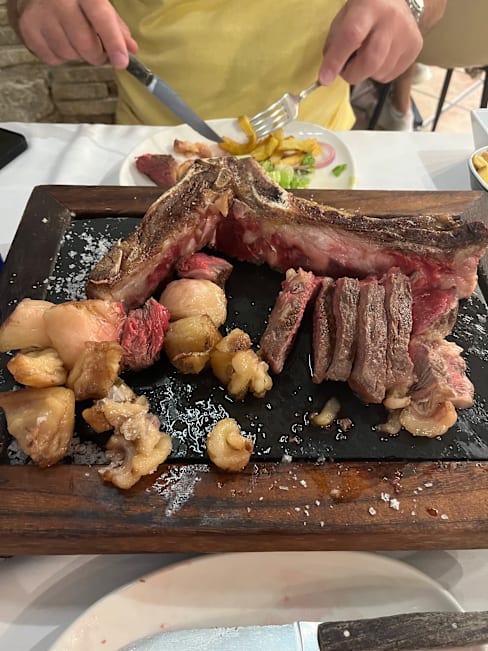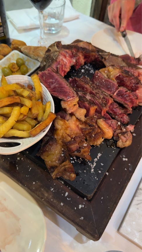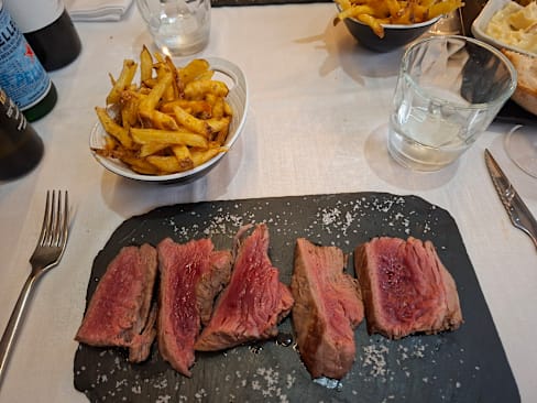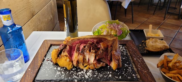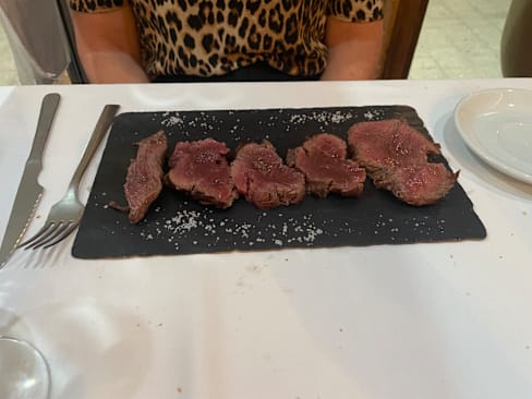 3/10Very poor experience. We ordered the rib eye on the bone at approx €70 for two persons. When it arrived it wasn’t cooked as requested ( medium) it was extremely rare . In addition to that the sliced up meat didn’t appear to match the bone that it supposedly came off and there was a pile of cold , white lumps of chopped up fat. We eat ribeye regularly so we know it’s a fatty steak which we don’t mind but I have no idea why the fat was removed from the meat, chopped up and served in a pile. Apart from the presentation being pretty poor and the steak not being cooked as requested we attempted to eat it but it was chewy, tough and tasteless so we called the waitress over who had a really bad attitude and was extremely cross that we were complaining. She did eventually take it away and stormed off in a mood , no apologies at all and totally ignored us after that. In addition to that the salad was extremely underwhelming and the fries were overcooked and dried up. A very poor experience!