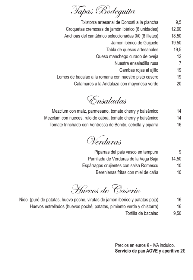 7/10We have ordered the Ribeye for two, as we have been there before and it was excellent. This time the cut was mostly non-chewable cartilage, hardly satisfactory. The fish was okay, served with a splash of vegetables so few, that it's more garnish, than a side. Wine was good, so we enjoyed that with bread very much before the food came. I hope this is a one–off, as it would be unfortunate to lose one my favorite places to eat in Alicante to a degradation in service and quality of food.