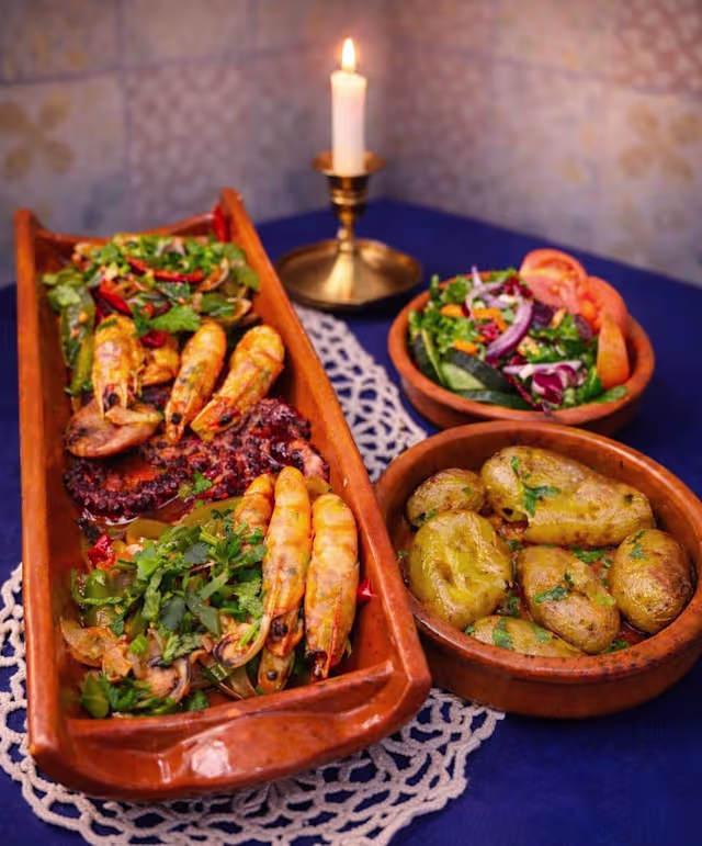 - Octopus with prawns, bohemia sauce, potatoes and salad