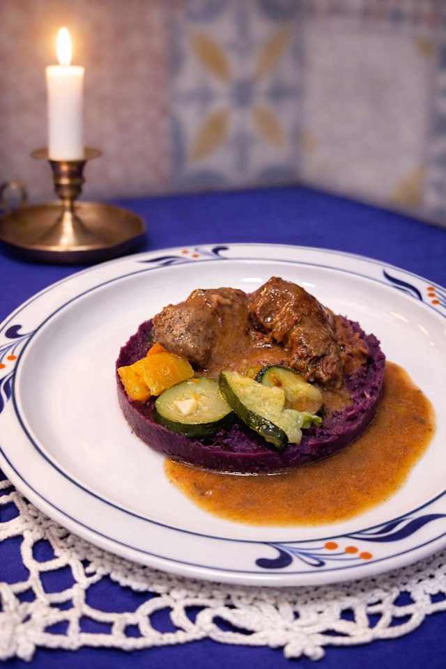 - Sliced cod-fish with confit onions, cabbage, chickpeas purée and béchamel