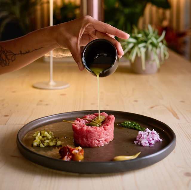- Tartare di fassona piemontese, condita con senape al miele, capperi, olive, cetriolini e scalogno.