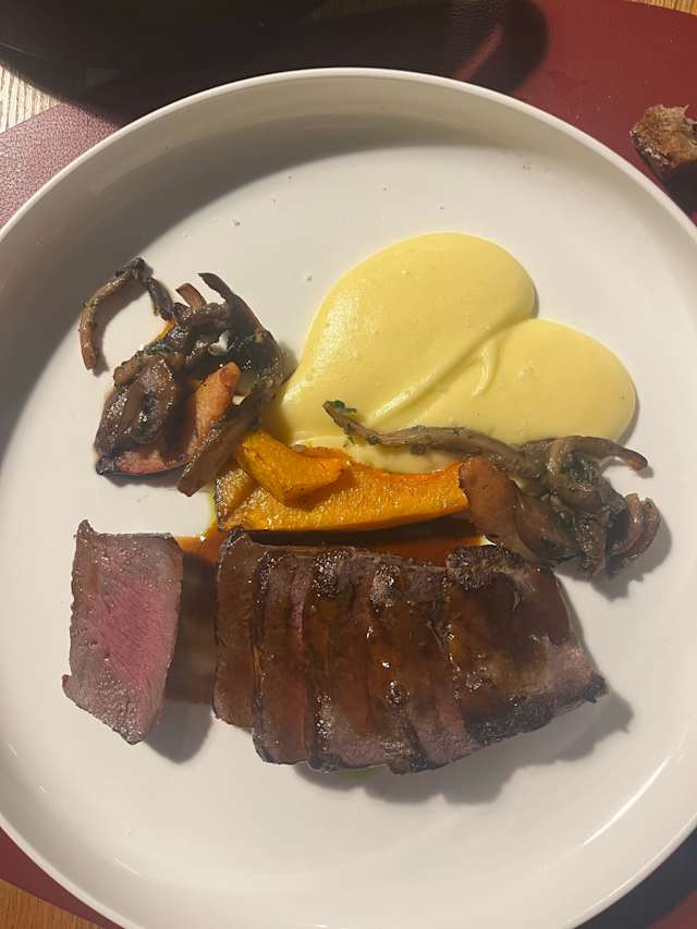 - Pavé de cerf maturé rôti au beurre, garniture chasse, jus corsé