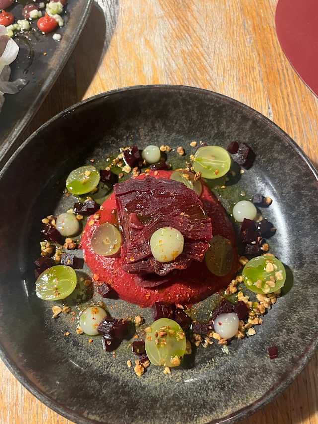 - Rosace de betterave confite au verjus, crémeux de betterave, fraîcheur de raisins chasselas et de betteraves, granola d’avoines et noix