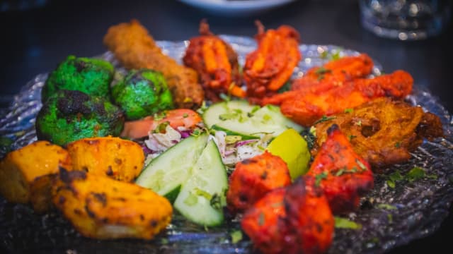 Cordero marinado en yogur especiado, cocinado en horno de barro. Se sirve con cebolla frita, limón y pimientos rojos.