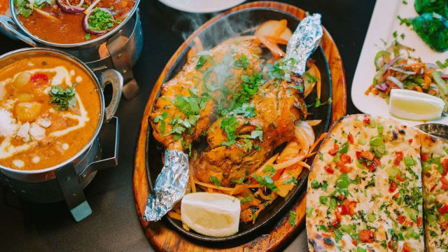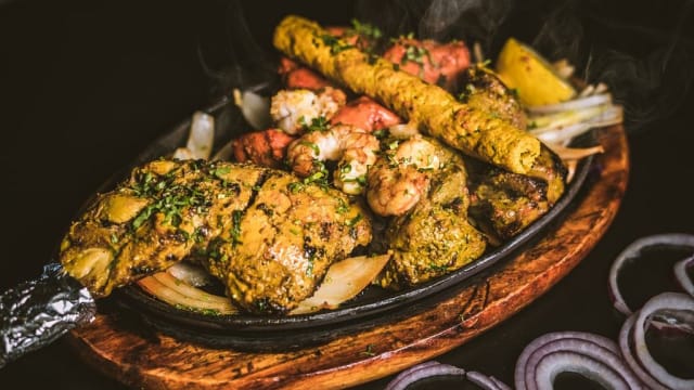 Pollo marinado en yogur especiado, cocinado en horno de barro. Se sirve con cebolla frita y limón.