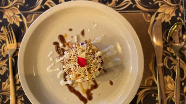 Iogurte, pasta de açafrão, pasta de manga, cobertura com batata crocante e especiarias moídas