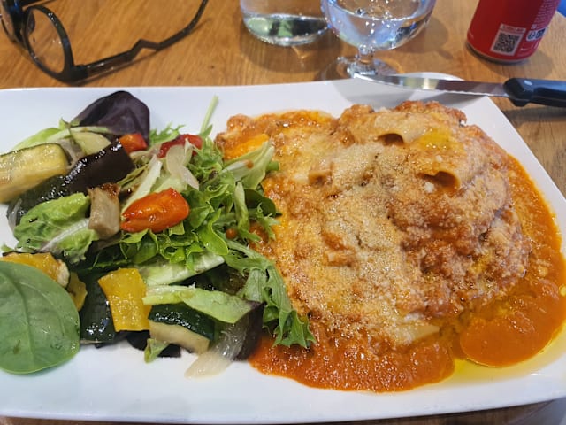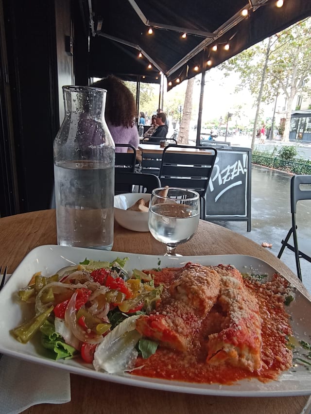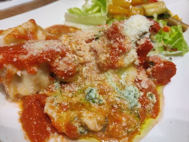 Pâtes fraîches roullées dans la sauce tomate, farcies ricotta/épinards, et grantinés au four avec parmesan. Accompagnement : salade mixte et légumes grillés