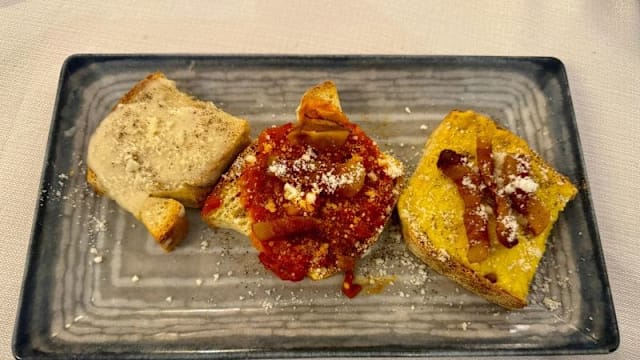 Bruschetta con sugo di carbonara / cacio e pepe / amatriciana