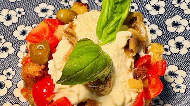 Datterini, cubotti di pane croccante, basilico, stracciata di burrata, olio evo, aceto di lamponi, alici del cantabrico e olive taggiasche