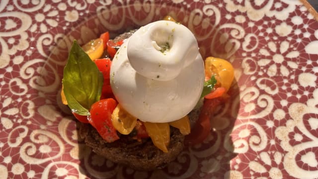 (Frisa de cebada, burrata, tomate cherry y pesto)